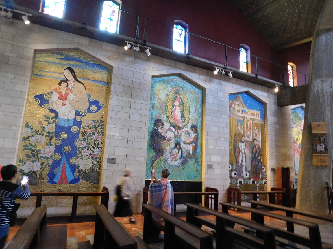La basílica de planta redonda está muy sugerente y en la planta de arriba hay cuadros sobre la Anunciación procedentes de muchos países. Me llama la atención el de Estados Unidos que parece una diosa blanca plateada. O el de Japón como una estampa exquisita. O el de Portugal hecho con retículas de azulejos.