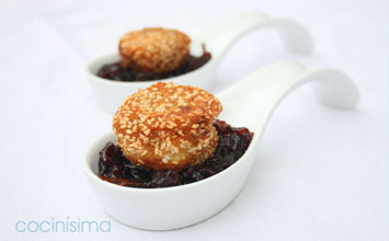 Formamos del puré de patatas unos bolitas, aplanamos, añadimos un poco de la manzana picada y encima un poco de morcilla, cerramos bien la bolita y rebozamos en huevo batido y después en sésamo blanco. Freímos a 160º hasta se vuelvan dorados. Retiramos con la espumadera y dejamos sobre papel absorbente.