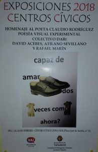 El próximo jueves 1 de febrero, a las 20,00 horas, tendrá lugar en el Centro Cívico Zona Sur de Valladolid (Plaza Juan de Austria, nº 11) la inauguración de la Exposición Colectiva de Poesía Visual «Homenaje al poeta Claudio Rodríguez».