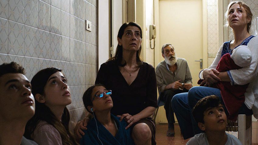 Alma Mater, quizá sería más explícito su título original Una familia siria, podría ser muy bien un documental sobre la vida cotidiana bajo la guerra en una ciudad siria cualquiera devastada por los bombardeos aéreos y los francotiradores. Una madre, Oum Yazan (Hiam Abbas) esa alma mater fuerte y decidida del título, sus hijas, el novio de una de ellas, su anciano padre, su criada Delhani (Juliette Navis) y la vecina Halima (Diamand Bou Abbod) con su bebé, cuyo piso ha saltado en pedazos, sufre el asedio de la guerra en su casa, la única que resiste en un edificio medio en ruinas por los bombardeos y que se niega a abandonar. De la casa fortaleza sólo salen para ir a buscar agua y en ella permanecen ocultos de los milicianos y de los desalmados que al socaire del caos roban, violan o matan.