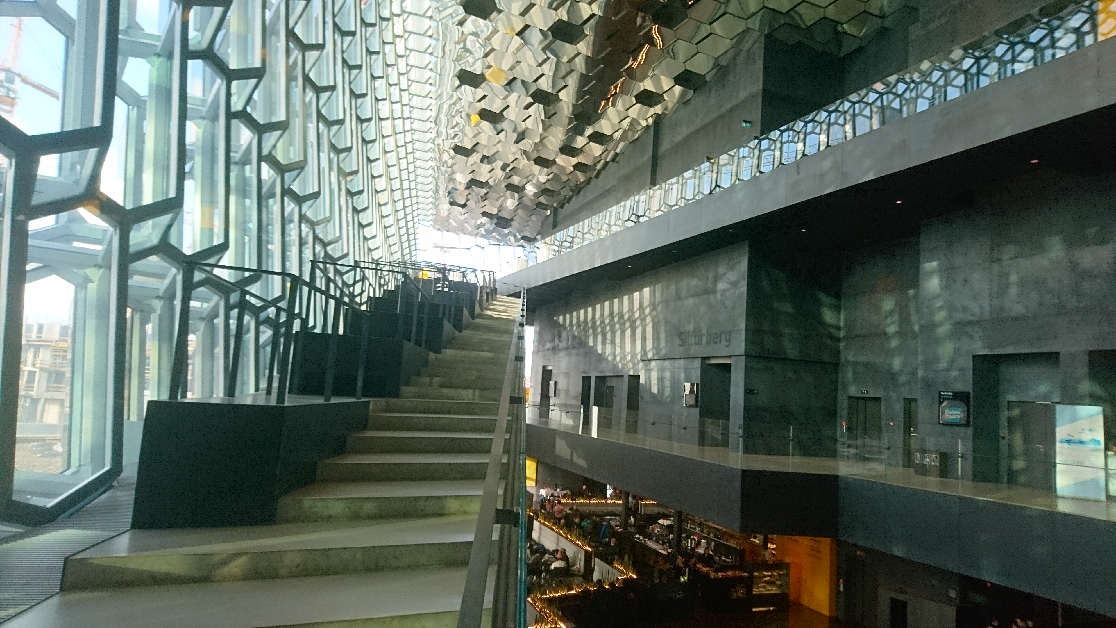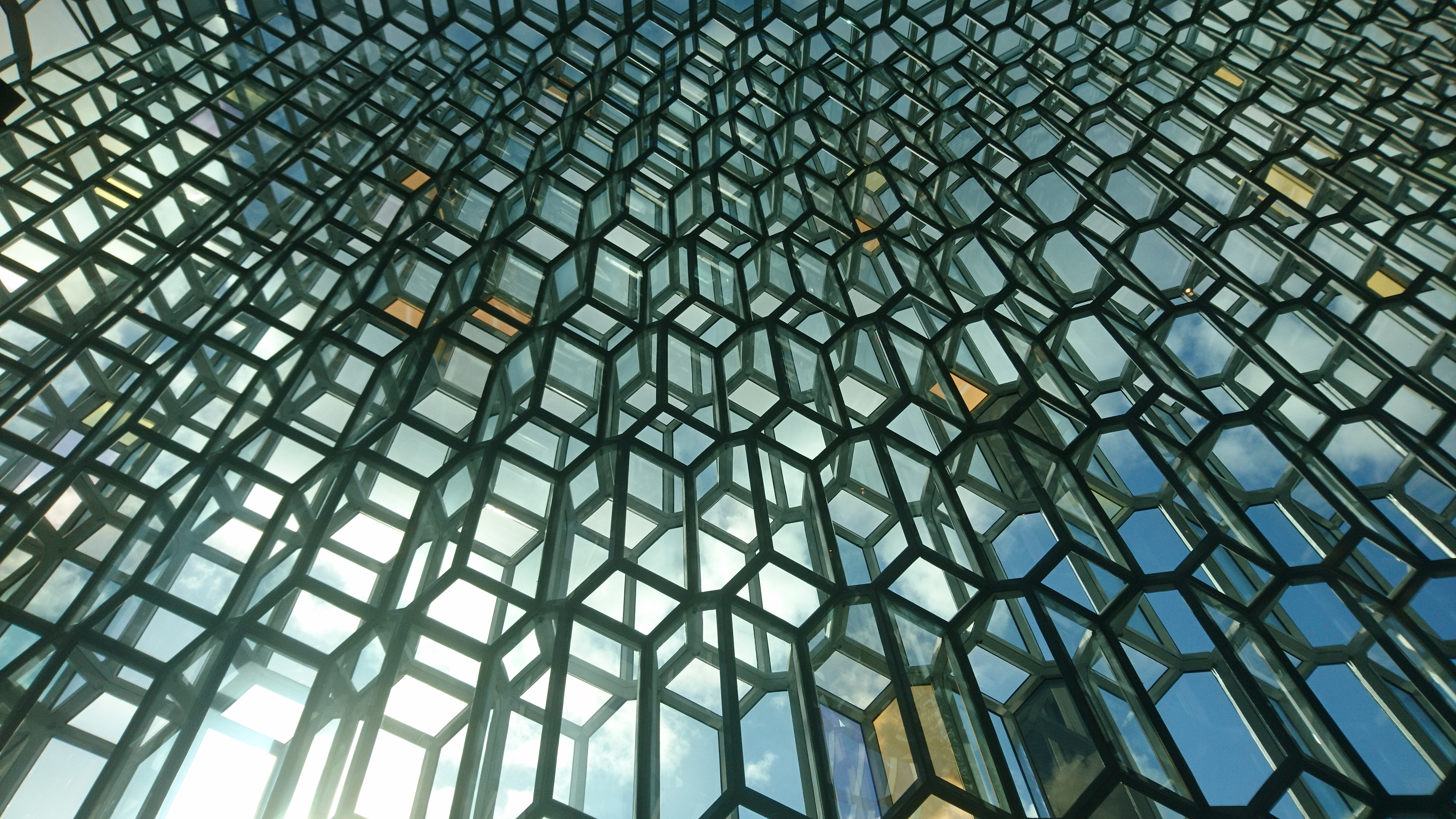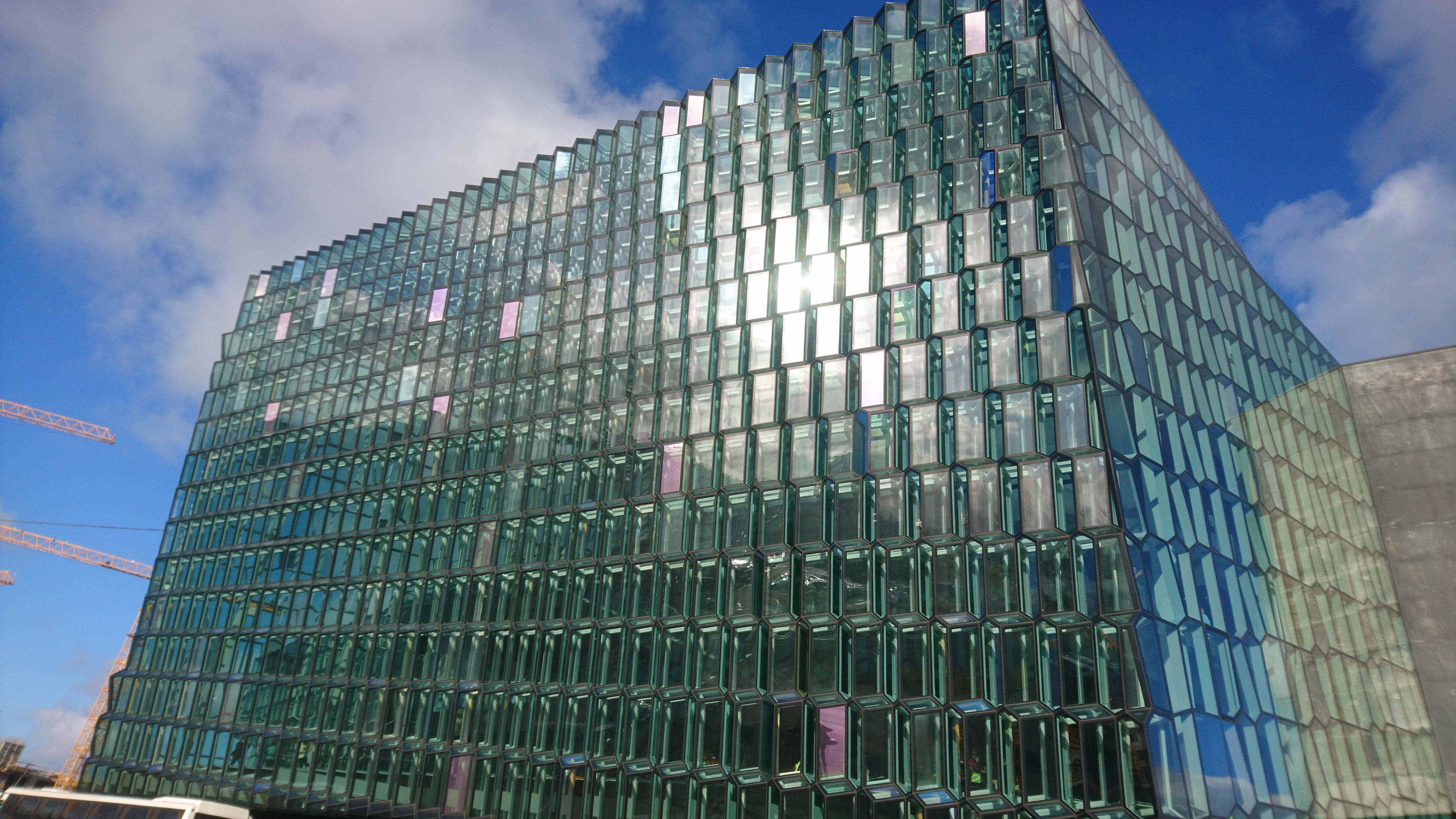 El Harpa Music Hall es impresionante. Un ejemplo de cuando la modernidad apuesta por la funcionalidad pero sin reñir con la belleza. Dos genios sumaron esfuerzos, Henning Larsen y Olafur Eliasson, y el edificio recibió el premio Mies van der Rohe. Dos formas geométricas oscuras, dos cubos rectangulares, los edificios que se empotran el uno en el otro; un espacio diáfano en el interior perpetuamente iluminado porque la techumbre y las paredes son de cristal y captan la luz del exterior, la transforma en un calidoscopio de colores en su interior. Se inauguró en el 2011 y en una de sus cuatro salas la orquesta sinfónica de Islandia interpretaba La flauta mágica de Mozart mientras Bjork cantaba Biophilia en otra. Clasicismo y modernidad. El Harpa Music Hall, centro de convenciones, palacio de conciertos y óperas, mira tanto a la ciudad como es mirado por ella. En una estructura exterior metálica muy ligera se encastran, como en una colmena, unos cuantos cientos de ventanales hexagonales que forman las fachadas de una fantasía geométrica. El edifico es escultórico pero no hay nada gratuito en él. El interior, escalonado, produce vértigo por su altura. El enorme teatro, ahora lleno de niños rubios que esperan que empiece su película de dibujos animados, hierve con el rojo de sus paredes. Reyjavick, como toda ciudad que lucha contra el frío, busca el calor en los colores vivos y adora la luz por ser un bien escaso.
