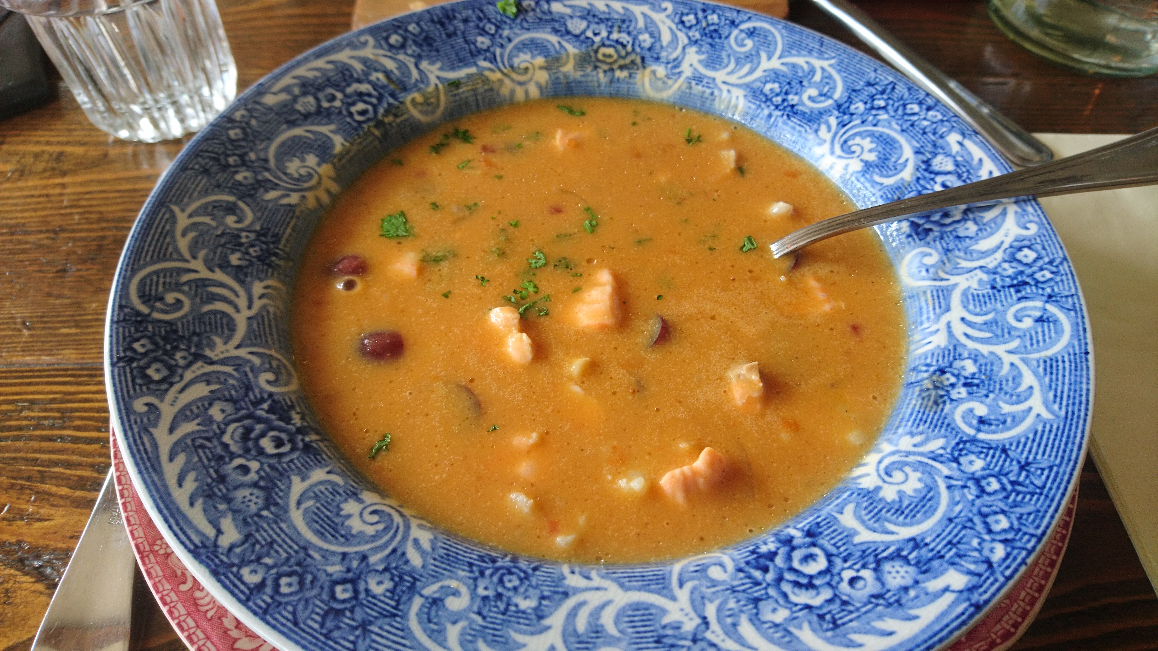 A las doce tiene hambre. El desayuno fue muy frugal. Indaga en restaurantes de la calle Posth Street. Los precios son prohibitivos y la clave es el número 3. Una entrada de cine vale tres veces lo que cuesta en Barcelona. Un cruasán 3 euros. Un plato no baja de 20 euros. Para el alcohol hay que multiplicar por cinco. Una cerveza oscila entre 8 y 10 euros. Así es que se deja guiar por el olfato, y el aroma que sale de un restaurante de pescado le convence. Hay una docena de mesas de madera. Es un sitio agradable. Los comensales son gente tranquila, de la zona. La camarera que toma nota es una chica rubia, nerviosa, enérgica. Pide una sopa y salmón. Se conforma con beber agua fría que no huele a huevos podridos. Le traen antes el salmón. Marinado. Exquisito. Sobre una base de pepino crujiente, nabo laminado, eneldo y gotas de limón. Lo paladea. Se deprime al acabarlo. La sopa de pescado viene luego. Lleva mantequilla, jugo de gambas, salmón, bacalao, uvas cortadas por la mitad y un toque de paprika y azafrán. Deliciosa. Paga 4.000 coronas con dinero de plástico. Una fortuna.
