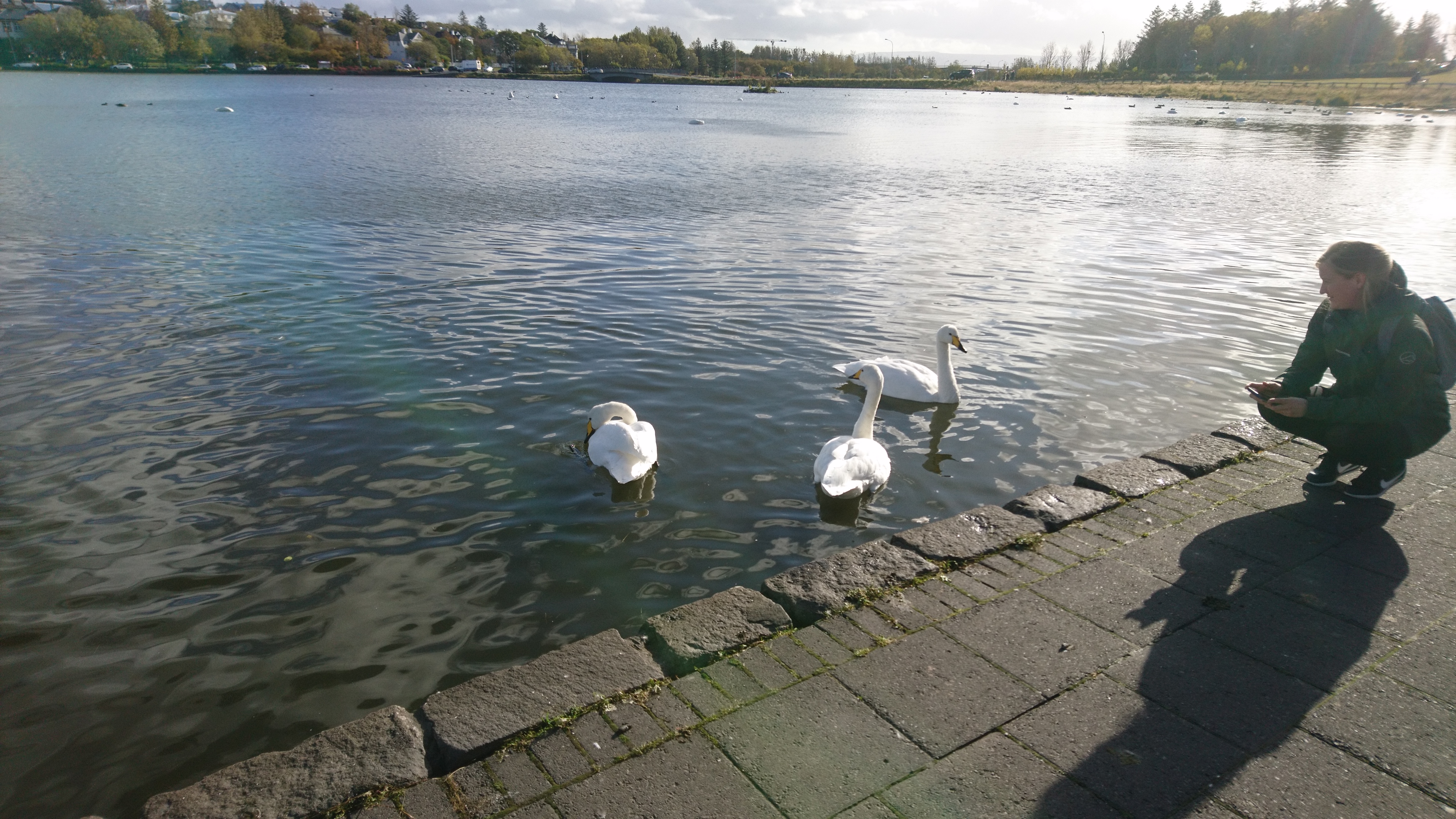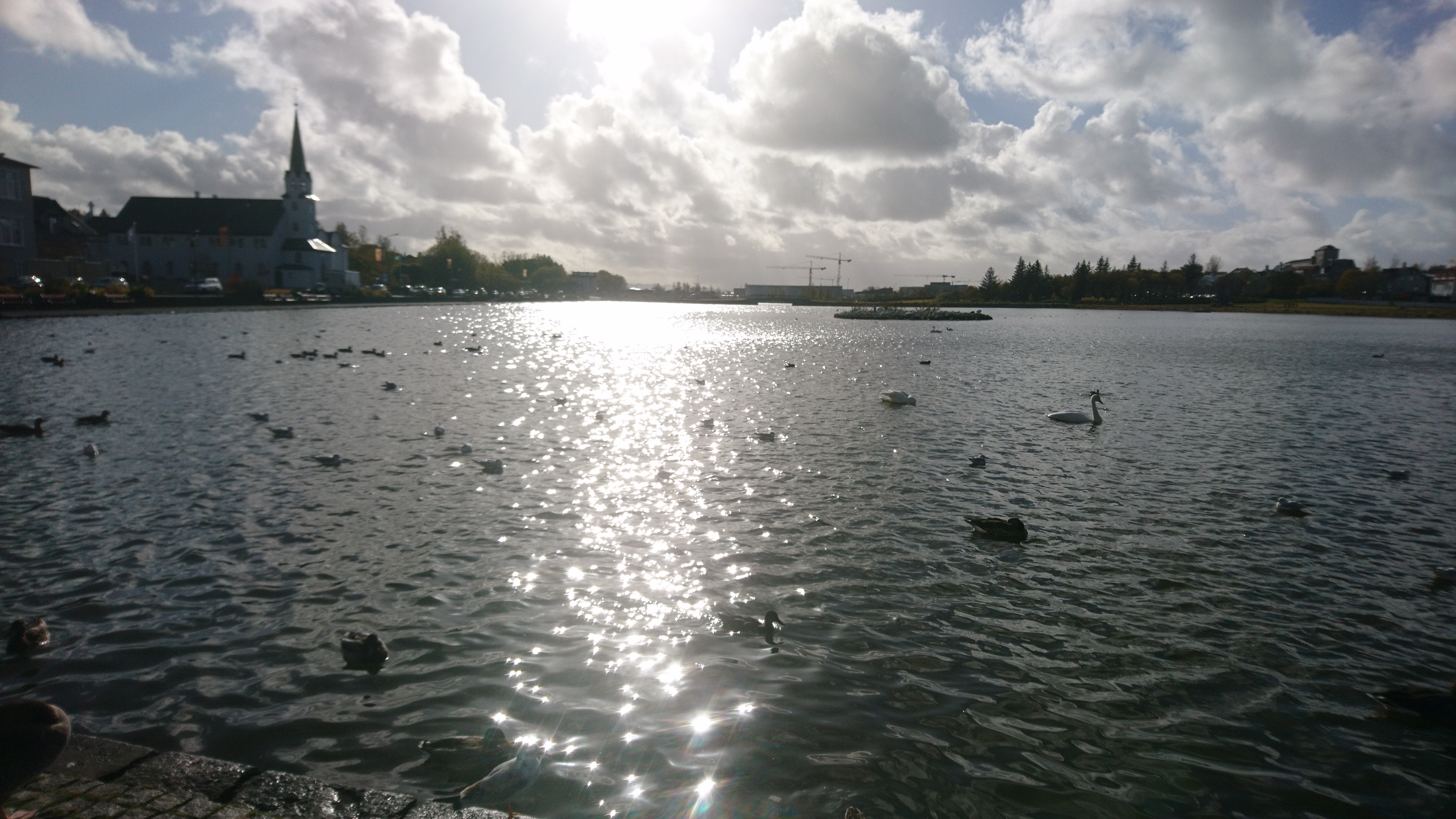 En el cielo azul se alternan nubes grises y blancas que dejan que el sol irradie entre sus grietas la capital. Le gustan esos focos naturales. Reina una luz negra atlántica que es la misma de Lisboa. Siguiendo la calle Posth llega al lago Tjörnin a cuya orilla está el edifico funcional del ayuntamiento que es también centro cultural. En el interior, en una de sus salas, fotos deslumbrantes de la naturaleza islandesa que no parecen reales. Cuando sale al exterior le atruena el escándalo de las aves. En el lago conviven, con sus tensiones espaciales, elegantes cisnes, ruidosos gansos, palomas vulgares, patos elegantes de cuello verde y las diminutas gaviotas que no son mayores que las palomas.