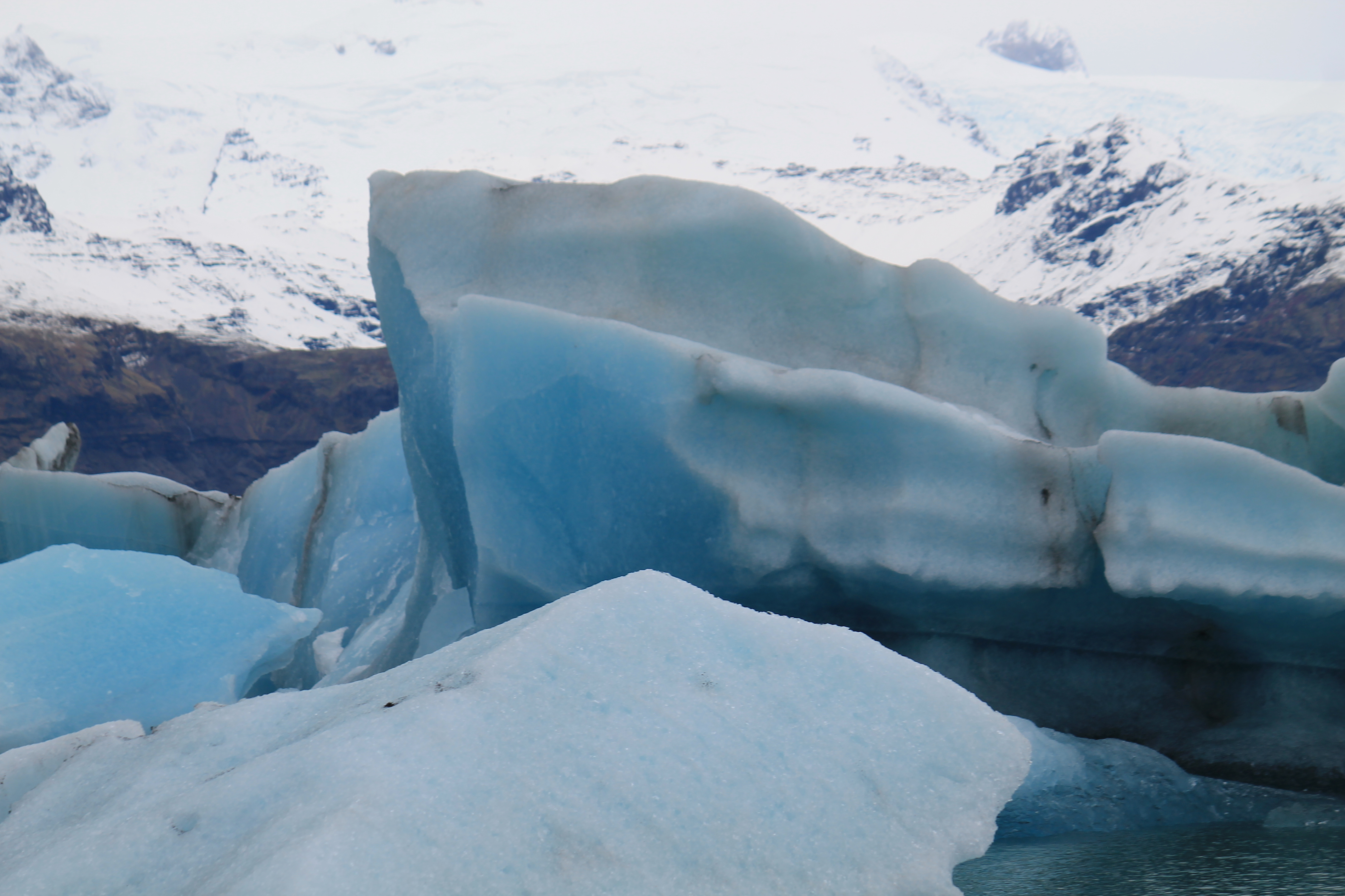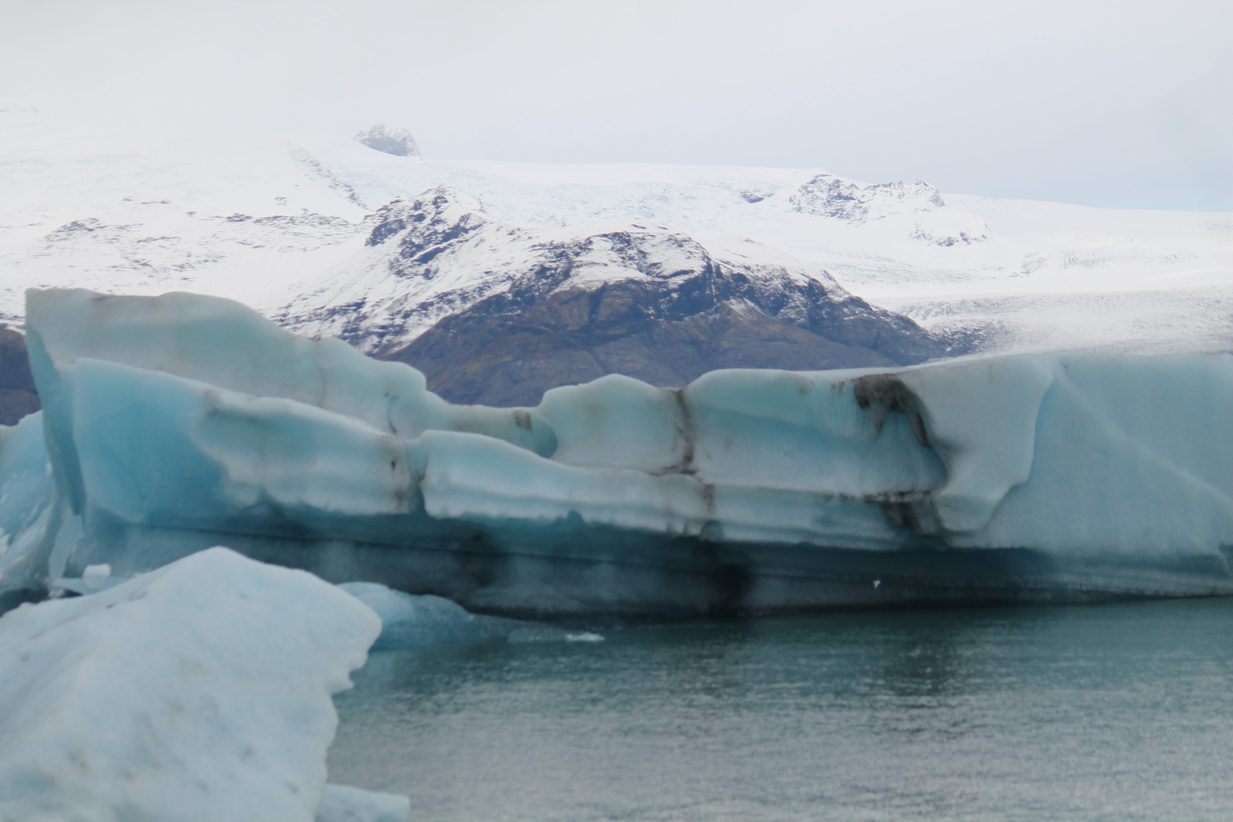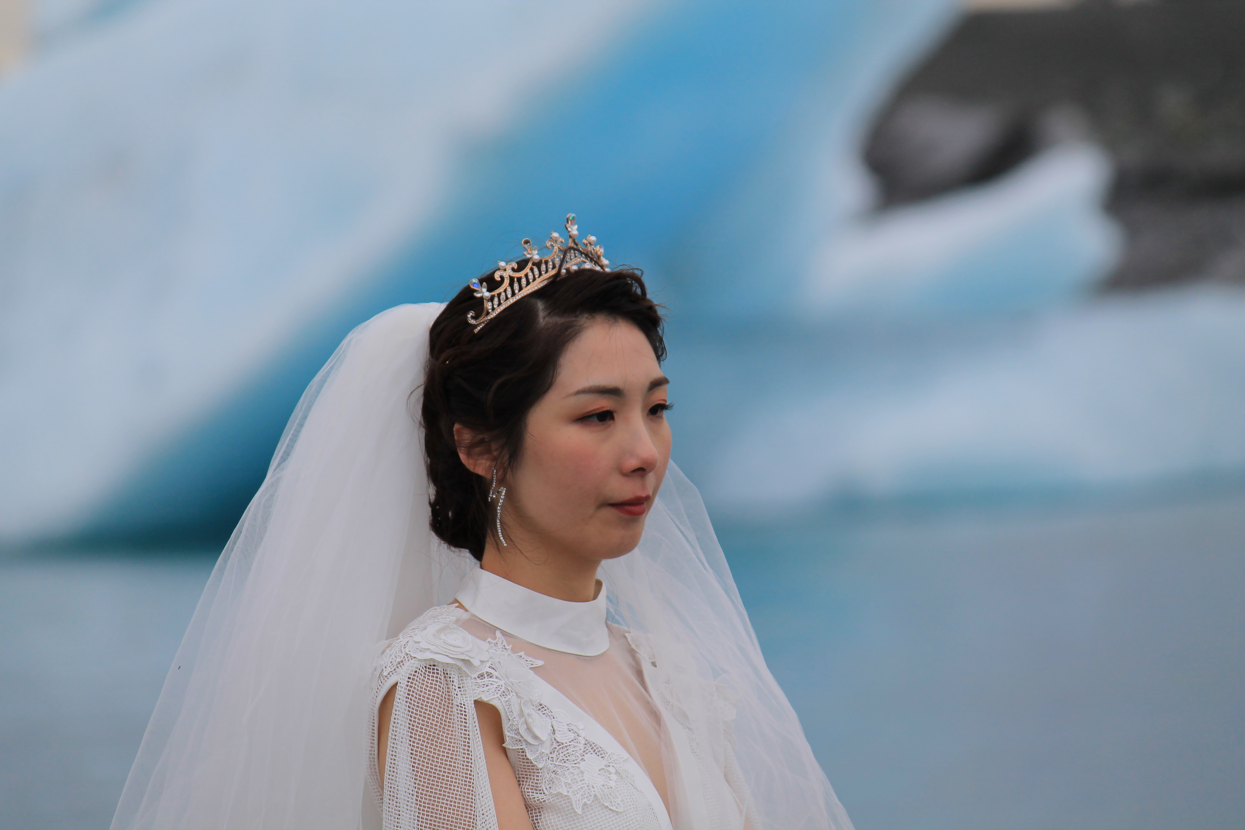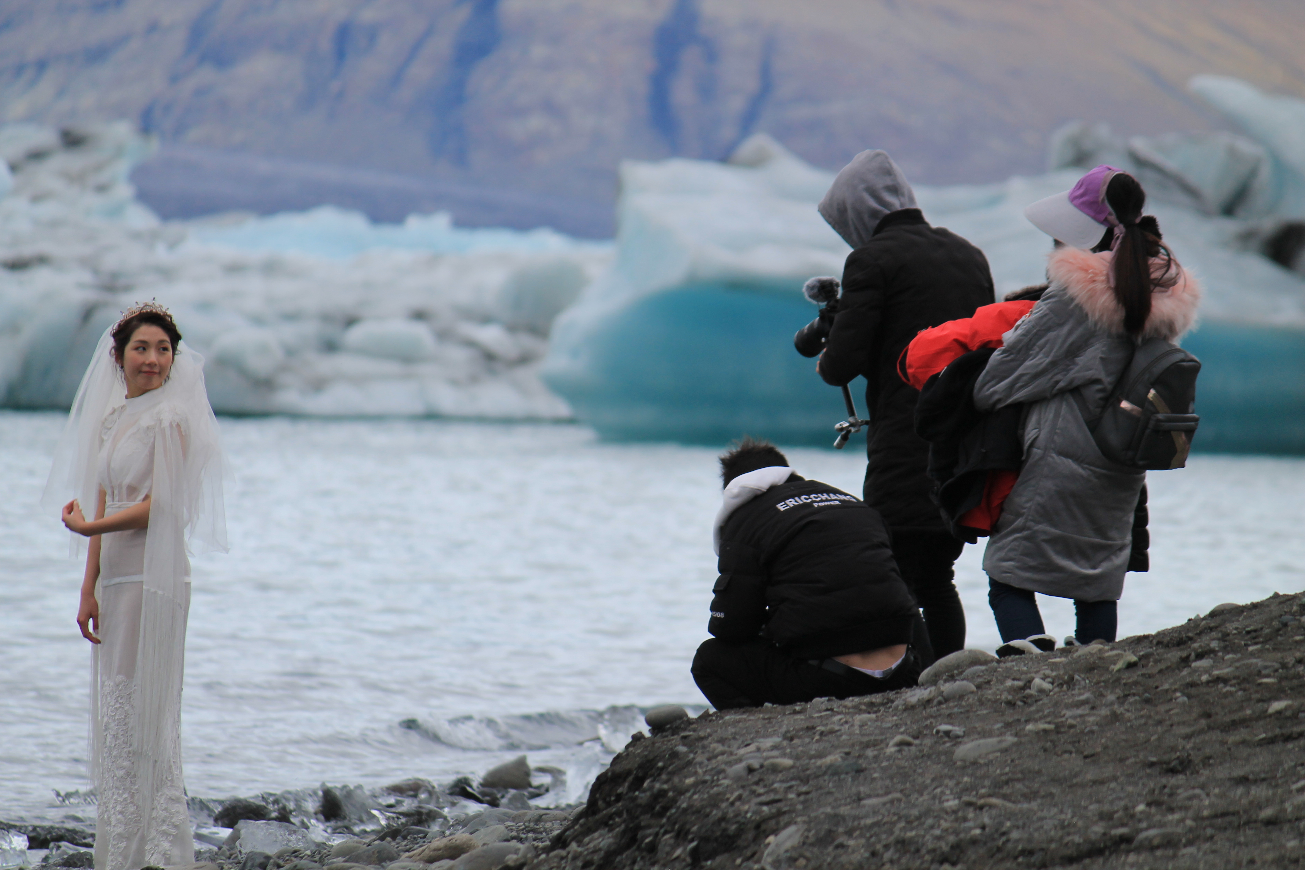 Rueda hacia el glaciar más grande de Europa, un sinfín de glaciares que se deslizan a una lentitud pasmosa entre las vertientes de volcanes y conforman gigantescas autopistas de hielo cuarteado. El Vatnajökull, que está antes de llegar a Höfn, a unos cincuenta kilómetros, deshiela en una laguna y esta a su vez en un brevísimo río que arroja los gigantescos icebergs al mar y el mar los devuelve a la arena en forma de exquisita joyas de cristal tallado: arte efímero. Resulta fascinante el contraste con la arena volcánica negra de la playa y de las orillas del lago volcánico y esa masa de hielo que se precipita al lago crujiendo, más las montañas blanqueadas por la nieve en tercer plano. Flotan en el lago una cantidad considerable de icebergs que son como islotes y grupos de turistas, pertrechados con ropa isotérmica, por si caen al agua, se adentran en el lago a bordo de lanchas neumáticas y vehículos anfibios. Y claro, hay chinos, y bodas chinas, y una china bastante bonita que posa con su vestido de novia, tiritando, ante los glaciares y se deja coger en brazos por su menudo recién adquirido marido.