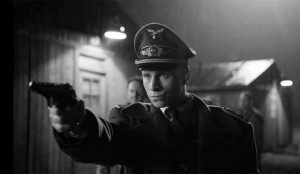 No hay nada icónico. Ningún personaje de amplio espectro que recrear dramáticamente. Ningún sesudo análisis sobre el odio, el racismo o el hecho diferencial pervertido. Los masacrados son alemanes (no nazis). Los que masacran también son alemanes (algunos nazis, la mayoría, no). “Der Hauptmann” es un estudio sobre la brutalidad de la guerra, sobre esa estrecha franja que nos separa del horror. Los protagonistas son seres patéticos, desnortados, esclavizados en la absurda burocracia del nacionalsocialismo. La semántica del cine de nazis aquí no es valida y podría extrapolarse a cualquier grupo humano en situación de guerra que, ante la inminencia de Tanatos, tratan de refugiarse en Eros para escapar al absurdo. Como sucede en la secuencia de la detención del grupo, entregado a orgías y olvidando la realidad que les rodea. Es la banalidad cotidiana del mal. Una radiografía de la conducta humana que, aunque parábola durante la segunda guerra mundial, podría aplicarse en todas las guerras y todas las ideologías. Ya basta de engaños de “buenos y malos”. El impecable blanco y negro (Mejor Fotografía en el Festival de cine de San Sebastian), fotografiado por Florian Ballhaus, contribuye al clima de abstracción y ajeneidad que rezuma la cinta. La fluidez narrativa convive acertadamente con lo abrupto de las propuestas, la tensión de algunos diálogos y la certeza de lo que va a suceder a continuación. Para ello rompe el esperado clasicismo del blanco y negro con abruptos movimientos de cámara. La eficiencia de los actores es soberbia, extrayendo matices de personajes degradables, pero cercanos. Repulsivos, pero reales. El autor inserta secuencias con una fuerte tensión interna, como la representación que dos prisioneros, cómicos a la fuerza, hacen con chistes escatológicos y envilecedores sobre judíos. Con gran habilidad hace al espectador partícipe de cual va a ser el resultado final de aquellas risotadas y brindis. Al contrario que el protagonista real, ejecutado en 1946 y condenado a muerte (irónicamente) por ambos bandos, el Herold de la pantalla es casi considerado un mal necesario. Una pesadilla de la que pueden sacar partido. El guiño final, haciendo referencia al cuerpo de los “werwolf”; la resistencia en las sombras, que iba a crearse en los ocasos del nazismo para aterrorizar a los vencedores y necesitaría hombres como él; es consecuente con el clima de pesadilla de toda la película. Intensificada por la soberbia banda sonora de Martin Todsharow.