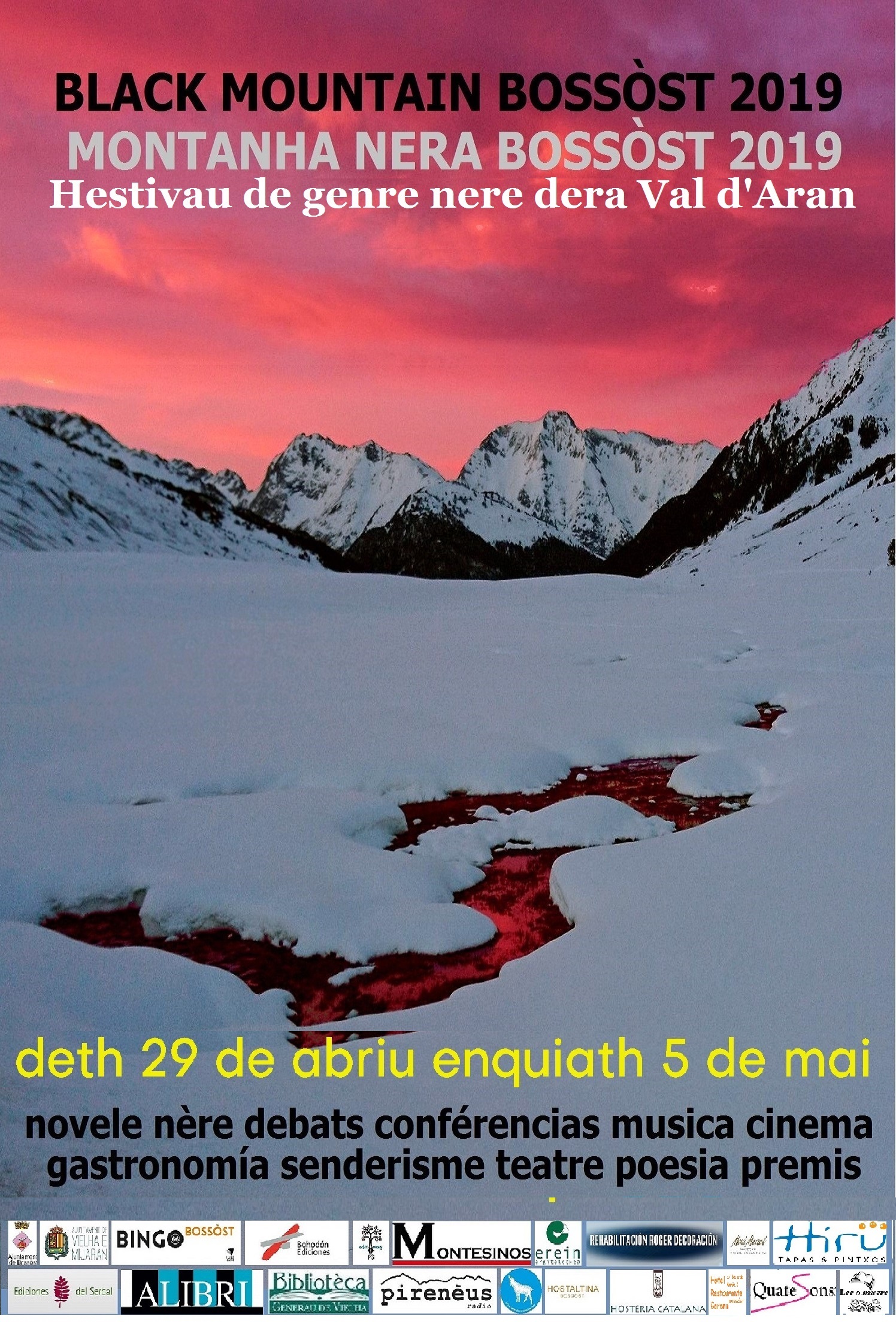 El festival ha acreditado a más de cuarenta personas entre escritores, gastrónomos, psiquiatras, periodistas, músicos, conferenciantes y críticos de cine, y eso ha sido posible gracias a las esponsorizaciones del Bingo Bossòst 66, las editoriales Erein, Montesinos y PG, los establecimientos hoteleros Hosteria Catalana, Hotel Garona y Hostal Tina, el bar restaurante Hiru, el blog de deportes de montaña Bailando con Sarrios, cavas Mont Marçal y Rehabilitación Roger Decoración.