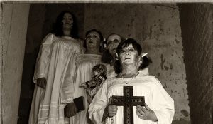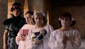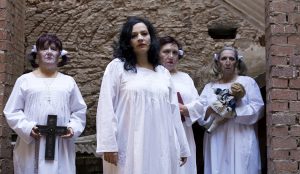 Los lúgubres acordes de la Tocata y fuga en re menor de J. S. Bach dan paso a un cuarteto de dantescas féminas. Envueltas en camisones góticos entonan una letanía antigua que; avisa e introduce; en un mundo cerrado, opresivo y obsesivo. Un universo de raíces lorquianas. Cuatro hermanas marcadas por los hechos terribles que sucedieron “esa noche” que rememoran una y otra vez, mientras vagan como espectros ¿o quizás lo sean?, por un decorado que rememora los cuentos de hadas pervertidos: unas camas de raíces palpitantes y trepadoras. A lo largo del texto, soportado en el racconto, va surgiendo la relación de las hermanas con su padre. Un coronel terrible con reminiscencias de aquel Saturno que devoraba a sus hijos y que nace directamente de la influencia de una escena de Carlos Saura en “Cría Cuervos”. Las mujeres (o los fantasmas) están atrapadas en los círculos de Dante y su vida es un continuo retorno como el mitológico Sísifo. Volviendo una y otra vez al mismo instante que las traumatizó Para desarrollar su liturgia catártica, las cuatro hermanas están acompañadas de obras musicales que se imbrican a la perfección en los instantes y vivencias. Para ello utilizan piezas populares como el lorquiano “El Vito” o incluso un bolero, certeramente interpretado por una de las hermanas. El espectro del padre, al modo hamletiano, sobrevuela (de referencia y presencia) el mundo del desdichado cuarteto. Incluso posesiona a Iniquidad que reproduce; habitada en marcial uniforme; el diálogo que el padre mantuvo esa noche con la hija ultrajada.