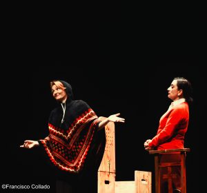 Ana García elabora un difícil personaje, una diosa díscola, políglota, que trata de guiar a Hombre y Mujer lejos de los buhoneros y vendedores de humo que acechan en la realidad. Paca Velardiez es la Mujer, con un intenso sesgo dramático, de amplia inflexión y recorrido. Jesús Manchón vuelve a destilar su personal punto de ironía y dominio del timing, para extraer aristas y matices. Quizás toda la realidad de la humanidad se condense en ese gesto final, tierno, revelador, catártico, de un hombre que lo ha perdido todo y le ofrece su paraguas a otra persona “Por si afuera llueve”.
