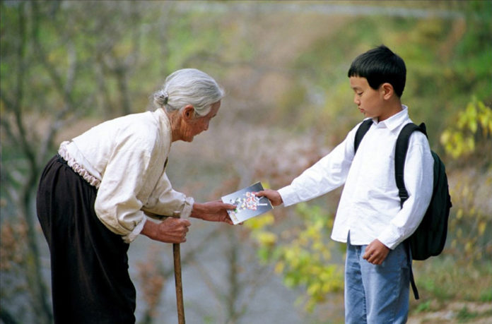 Sang Woo (Seung.ho Yoo) podría ser el paradigma de cualquier niño actual. Adicto a la televisión, a los videojuegos, a la alienante tecnología, ignora como extraer la savia del instante, como habitar el momento. Un arte en el que la abuela es una maestra. El inicio de la relación es un reflejo de la sociedad en que habitamos. Un niño cruel, soberbio, falto de empatía que ignora el cariño, se ríe de su abuela o la humilla. Ella es una de esas personas duras, cinceladas a granito por la vida. Encorvada por el trabajo, pero altiva en su dignidad. Su sabiduría de siglos y su paciencia (algo de lo que carecen las generaciones actuales), conseguirá penetrar la defectuosa coraza que el ritmo de vida ha cerrado en torno a su nieto. Hay mucha humildad en la concepción de la puesta en escena, incluso algunos de los extras son realmente vecinos, lugareños que habitan en el pueblo.