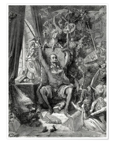 El actor va desgranando el sueño de Don Quijote. Surge un minueto de ingenua melodía que recuerda el galopar del caballo, acompañado de las largas notas de la orquesta y pausas notorias. Los ataques a los molinos se representan por notas repetidas en un tempo rápido. Es el momento en que el caballero desnortado ataca los molinos con su harapienta armadura y su bacía de afeitar por casco. Las notas sirven de representación de imaginarios enemigos, dragones, monstruos y demás entelequias, con un concepto irreflexivo, pero sin perder cierto regusto por los adornos y filigranas, matizadas en saltos constantes de la cuerda. La narrativa es acometida por la OBB, que implica en el dinamismo inherente al allegro e invita al publico a seguir el decurso del episodio. La constante retoma del tema principal nos adentra en el intercambio de pareceres entre hidalgo y criado, la invocación previa al imaginario combate y el trágico desenlace.