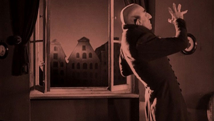 El Conde Orlok (soberbio Max Schreck) causa pavor por su presencia inquietante e inhumana. Todo lo contrario que el relamido vampiro interpretado por Bela Lugosi para la Universal, un aristócrata mundano y de modales refinados. Toda la escenografía del vampiro de Murnau se apoya visceralmente en lo siniestro. En lo visualmente inquietante. Desde ese cochero (él mismo) guiando el carro más siniestro de la historia del cine; con sus caballos enlutados; hasta la misma imagen antropomórfica del protagonista. Una mezcla de ser humano y murciélago. En Nosferatu está ese uso que Murnau hacía del contraste para causar inquietud. Otra secuencia que es completamente distinta es el momento de la firma del contrato. En la obra de Murnau, está presente la abyección en la mirada del monstruo cuando descubre el camafeo con la imagen de Ellen. El vampiro alaba la delicadeza del cuello de la mujer, absorto, palpitante, sobre el contrato de compraventa. Lugosi invita al agente inmobiliario a subir una escalera mugrienta, habitada de telarañas mientras sonríe, burlonamente, con un rostro pálido y malsano. Los recursos de Murnau pasan por la solarización (escena de la carreta), la utilización de virados. El Drácula (Tod Browning. 1931) interpretado por Lugosi es mucho más parco en efectos basando lo inquietante en la interpretación y la puesta en escena. Murnau juega con el original literario y llama Hutter a quien en realidad era Jonathan Harker, pero Browning también cambia los parámetros y es Renfield el que visita al conde en su siniestra mansión. En realidad, Renfield era un interno del manicomio, aunque Murnau lo sitúa como patrón del enviado a Transilvania. El personaje de Ellen en realidad era Mina Harker en la obra genésica. Frente al aristócrata con smoking que aguarda, soberbio, desde la escalera al recién llegado, el director alemán opta por presentarnos a Nosferatu casi a contraluz, encorvado y siniestro, en su primer encuentro con el abogado.