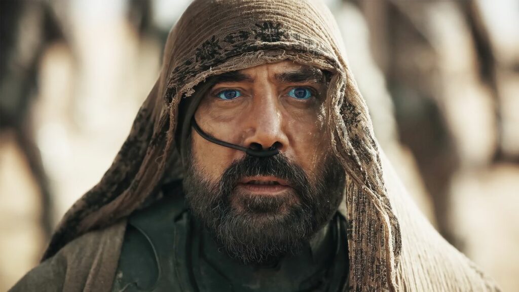 Hay una escena de lucha en un circo, impresionante por la escenografía, que parece sacada de Gladiator. Feyd-Rautha (Austin Butler), el sobrino joven del obeso mórbido barón Vladimir (¿por Putin?) Harkonnen (Stellan Skarsgard), se desprende de su aura protectora para acuchillar a sus tres adversarios ante una multitud enfervorecida. Los nazis, y los fascistas, también se miraban en el Imperio Romano. Y luego están esos gusanos de arena que son domesticados por los fremen (no se sabe cómo llegan a ese acuerdo) y guiados por ellos, literalmente cabalgándolos (tuve ahí un flash de La historia interminable), contra los harkonnen. Y hay un emperador, Shaddam Corrino IV (Christopher Walken) que se somete a Paul Atreides y le rinde pleitesía, cosa poco creíble, hasta el punto de arrodillarse y besarle la mano. ¿Y cómo los fremen, que siempre aparecen como una banda de cuatro gatos, y desarrapados, nada tecnológicos, de repente se multiplican y se convierten en miles de una escena a otra cuando asaltan la fortaleza de los harkonnen que nada hacen para defenderla? ¿Y la famosa especia, que se nombra como la quintaesencia de Arrakis, dónde está? Bueno, si, Paul Atreides come un plato y comenta que está muy especiado a su madre, Lady Jessica (Rebeca Fergusson), que por edad podría ser su hermana, y se convierte en Reverenda Madre de los Fremen, del mismo modo que Gaius Helen Mohína (Charlotte Rampling, que siempre aparece con el rostro tras un velo) es otra Reverenda Madre de los Corrino.