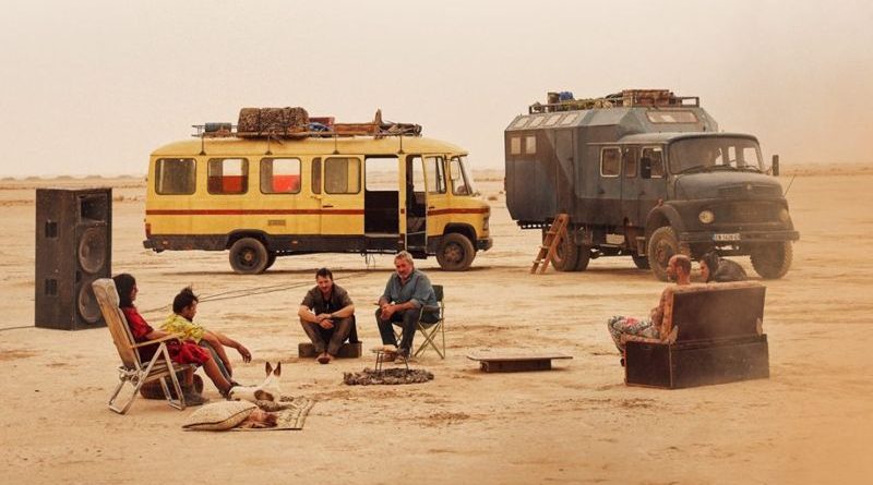 Óliver Laxe opta por la aspereza (la fotografía del desierto está en las antípodas de El cielo protector, el desierto no es ensoñación sino pesadilla), por el feísmo (los componentes de ese grupo variopinto que circula en estrambóticos vehículos adaptados al terreno son físicamente repelentes y remiten a lo postapocalíptico de Mad Max, aunque bajo esa apariencia física que provoca el rechazo haya ternura y solidaridad, término este en desuso). El entorno, con sus vientos huracanados, sus tormentas de arena, sus ríos infranqueables, se convierte en un infierno que deben atravesar los componentes de esa expedición mística tan enloquecida como la de Fitzcarraldo de Werner Herzog en busca de ese El Dorado (la rave en Mauritania) que no se sabe si solo existe en su mente. El río Congo es el desierto del Sahara del que huyen en estampida los miserables de la tierra sacudidos por las guerras: en una de las escasas gasolineras del desierto se agolpan cientos de camiones con refugiados que huyen del caos. Sirat, según la religión islámica, es el puente que los justos deben cruzar en el día del juicio para llegar al Paraíso, más delgado que un cabello y más afilado que una espada.