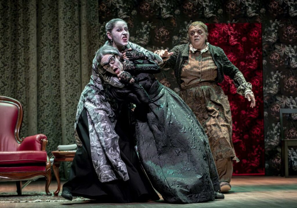 Un adecuado uso del espacio escénico (Carlos Lorenzo) y una señera dirección de Sandro Cordero, permiten que esta sucesión de cuadros humanos, con las descarnadas pinceladas de Gutiérrez Solana, permiten un desarrollo dinámico del despiadado texto (y tremendamente divertido). Mujeres de negro, mujeres enlutadas, en señero homenaje a la literatura gótica. Tan enlutadas como sus almas que se van desgarrando misturando la nerviosa carcajada con el hachazo de sus actos reprochables y reprobables. La ranciedad y el abolengo con aroma a naftalina impregnan la Casa Grande en medio de una correcta iluminación, plena de haces, de matiz expresionista (Félix Garma).