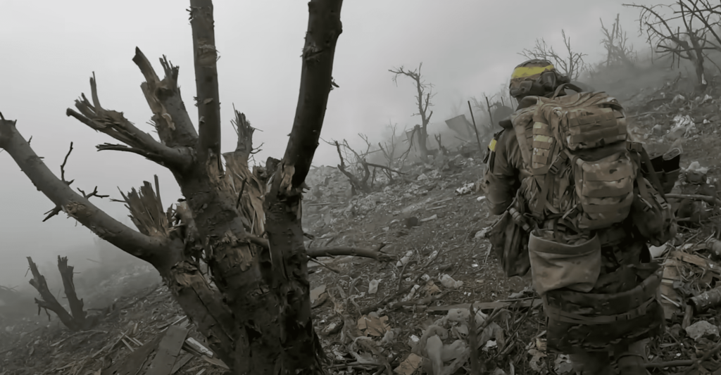 Parece el documental una película dogma, pues la cámara se revuelve, gira sobre si misma, tiembla en la mano de quien la empuña, se ciega ante las explosiones de las granadas. El enemigo es alguien anónimo, a quien apenas se enfoca, lejano, sobre el que dispara esa patrulla ucraniana que pelea por su tierra y no sabe cuando terminará este absurdo combate. Por ese raquítico bosque, que no protege a nadie (una delgada línea en medio de una llanura sin fin) avanzan esos hombres que rechazan el apelativo de héroes y no saben por qué son filmados por el fotoperiodista. Muchos de ellos, nos cuenta el realizador mientras los entrevista, morirán en esa operación o en otras que vendrán. No son soldados profesionales sino civiles que empuñan las armas por patriotismo. Los disparos son secos, no son como los de las películas bélicas que retumban en los oídos. Las explosiones de las granadas no son dantescas, lo más que hacen es levantar montañas de tierra. Los muertos, desparramados, sobre los que saltan los soldados de la patrulla ucraniana, no tienen rostro, permanecen abatidos sobre ese paisaje yermo y quemado. Esa guerra es absurda y aburrida, porque en la toma de ese enclave que ya no existe no hay ni siquiera adrenalina y no se sabe bien porqué arriesgan unos y otros el pellejo. Disparan contra rusos que salen de los rudimentarios bunkers madrigueras excavados en la tierra cuando lejos de rendirse les lanzan granadas. Todo en 2000 metros hasta Andriivka, que es la distancia que recorre esa patrulla, es muy diferente a una película bélica. Un ruso, al que hacen prisionero y al que le dan un poco de agua, no sabe lo que hace allí, peleando por un puñado de tierra, entre cascotes de lo que fue una aldea. Y todo por clavar la bandera ucraniana que al día siguiente será sustituida por la rusa.