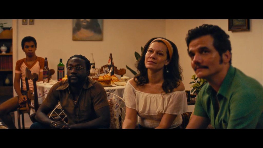 Porque hay cines de barrio en donde se proyectan, entre otras películas, Tiburón (y un tiburón de verdad que se ha comido una pierna humana); una rigurosa reconstrucción del Brasil cutre de los 70 con policías tan corruptos y poco profesionales que parecen de chiste; militares expulsados del ejército que asesinan por encargo y tiran cuerpos a un pantano; agentes que intercambian una pierna de jamón por una humana que sacaron de las fauces de un tiburón cazado y un fugitivo llamado Marcelo (Wagner Moura), un profesor que se pide un trabajo en el registro civil de Recife para buscar la ficha de su madre, al que un empresario y su hijo tonto quieren matar y el espectador no sabe bien por qué. Hay un niño, Fernando, sin madre, el de Marcelo, muy mono y que cuidan sus abuelos; un suegro proyeccionista de cine (aparte de Tiburón proyectan La profecía, pero en la platea de ese cine las prostitutas hacen sus trabajos a espectadores poco interesados por lo que se proyecta en la pantalla); sicarios que subcontratan, no se sabe bien por qué, a otro sicario más chapucero todavía que ellos; policías realmente guarros, como Torrente, que circulan en coches patrulla destartalados; unos cuantos cadáveres sanguinolentos, alguno putrefacto (al inicio, tapado por cartones y acechado por perros en una gasolinera), en lo que quiere ser un retrato de la época dictatorial de Brasil, pero sin que se haga especial mención a la represión, y queda en esperpento. Lo grotesco se come lo social en el film de Kleber Mendonça Filho.